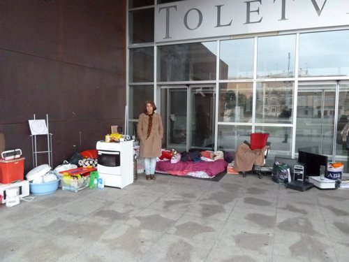 Rania ha pasado la noche bajo el techo del centro de recepción de turistas, que permanece cerrado desde 2011, junto a una cama con mantas para dormir, una cocina antigua y bombonas de butano para poder comer; así como ropa, productos de aseo y limpieza, y otros objetos como un ordenador, una televisión y libros, aunque durante este miércoles, una amiga le va a guardar «sus cosas» para poder desplazarse ante la puerta del Consistorio toledano.