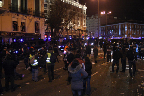 Sí, es verdad que al caer la noche la manifestación empieza a desvanecerse quedando varios miles de personas entorno a la plaza de Neptuno y sin mostrar una actitud especialmente hostil, continuaron simplemente con la protesta. Al poco tiempo, empiezan los movimientos del desproporcionado destacamento policial apostado por todas las calles aledañas y rodeando todos los lugares de la vía urbana, se ponen en posición, hacen pequeños grupos y avanzan. Los furgones se empiezan a mover a grandes velocidades y empiezan a cortar calles.