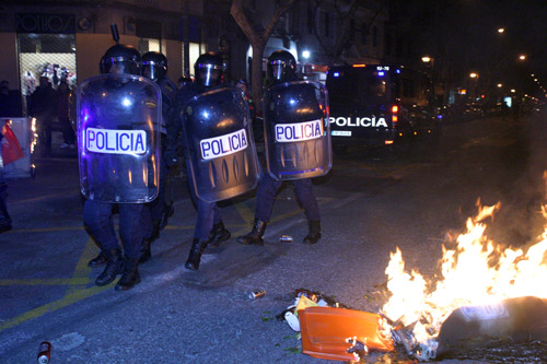 La detención de 40 personas, después de una hora de los primeros incidentes, cuando realmente no se produjeron disturbios serios (dos contenedores quemados, sillas en el suelo y poco más), demuestran las directrices del Gobierno en aplicar por su cuenta el estado de excepción y por ende la criminalización instantánea de cualquier movimiento que se oponga al régimen. Quien haya sido testigo de unas cuantas manifestaciones en el Estado o tira de hemeroteca, se puede comprobar que siendo menos de la mitad de detenidos, hubiera sido por lo menos una batalla campal.