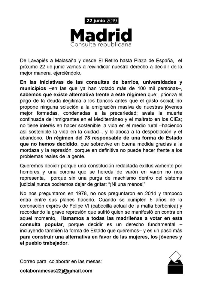 Consulta Republicana en Madrid (22J) 28 mayo, 2019 IzCa Destacadas 0 Comparte este artículo: Llega la hora de elegir lo importante. Llega la hora de elegir sobre la forma de estado. Madrid toma el testigo del derecho a decidir. Las verdaderas elecciones son el próximo 22 de Junio. Puedes seguirlo en Twitter o Facebook Comparte este artículo: