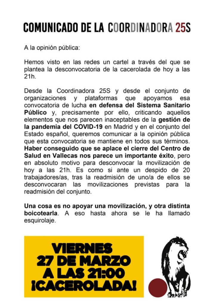 Comunicado de la Coordinadora 25-S sobre la convocatoria del 27 de marzo 27 marzo, 2020 IzCa Destacadas 0 Comparte este artículo: Comparte este artículo: CoronavirusCOVID19Crisissanidad