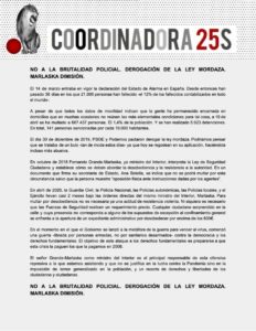 Así mismo, queremos trasladar que hemos comunicado a Delegación del Gobierno nuestra voluntad de realizar un acto de protesta el jueves 23 de abril delante del Congreso aprovechando que ese mismo día comparecerá el Sr. Marlaska.