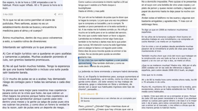 Por ello, Méndez añade que estos foros, haya covid o no, son el lugar perfecto para comprobar para qué sirve la prostitución. «Creo que es imposible leer un foro de puteros y seguir manteniendo la postura de que la prostitución es un trabajo como cualquier otro y que los puteros no son violadores, sino respetables clientes. Es imposible seguir diciendo que son personas que se preocupan por las mujeres prostituidas y que actuarían en cuanto vieran algún síntoma de que esa mujer es víctima de trata. Lo que nos dicen estos foros es que saben que las mujeres no están ahí por gusto, sino por necesidad, y se aprovechan. No tienen problemas en estigmatizarlas, en sacar toda su misoginia, su clasismo y su racismo cuando hablan de ellas. Cuentan cómo a peores condiciones de vida de esas mujeres, mejor para ellos para extorsionarlas y obligarles a hacer prácticas de mayor riesgo y de violencia por menos dinero», añade.