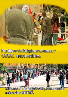 A día de hoy hay no es solo que casi 1 millón de personas trabajadoras siguen sin haber cobrado los ertes, esto según sus datos oficiales, sino que además hay gente viviendo de la economía sumergida, o trabajando como falsos autónomos, o en condiciones de miseria, además de los vídeos que se están moviendo por redes,de colas inmensas de trabajador@s en cantidad de barrios y pueblos para poder recoger una cesta de comida y ocultado por las distintas terminales mediáticas, todas al servicio de la casta y la nueva casta política, de la patronal, la banca, la monarquía, y de un régimen al completo que solo está al servicio del modelo neoliberal, de las elites económicas, del capitalismo financiero internacional y del imperialismo angloamericano y franco-alemán.