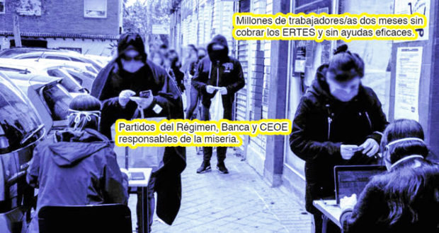 A día de hoy hay no es solo que casi 1 millón de personas trabajadoras siguen sin haber cobrado los ertes, esto según sus datos oficiales, sino que además hay gente viviendo de la economía sumergida, o trabajando como falsos autónomos, o en condiciones de miseria, además de los vídeos que se están moviendo por redes,de colas inmensas de trabajador@s en cantidad de barrios y pueblos para poder recoger una cesta de comida y ocultado por las distintas terminales mediáticas, todas al servicio de la casta y la nueva casta política, de la patronal, la banca, la monarquía, y de un régimen al completo que solo está al servicio del modelo neoliberal, de las elites económicas, del capitalismo financiero internacional y del imperialismo angloamericano y franco-alemán.