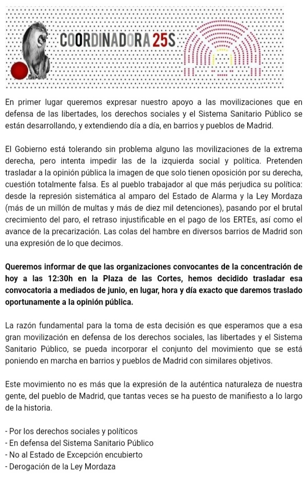 Queremos informar de que las organizaciones convocantes de la concentración de hoy a las 12:30h en la Plaza de las Cortes, hemos decidido trasladar esa convocatoria a mediados de junio, en lugar, hora y día exacto que daremos traslado oportunamente a la opinión pública.