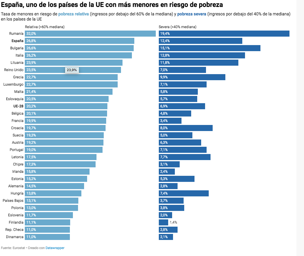 La tasa de pobreza infantil de España es la segunda mayor de toda la UE, con un 26,8% de los menores de 18 años en riesgo de pobreza relativa. Solo nos adelanta Rumanía, con un 32%. Si atendemos a la tasa AROPE, uno de cada tres niños en España se encuentra en riesgo de pobreza y exclusión social, el 29,5%. En este caso, nos adelantan otros estados además de Rumanía, lo que nos coloca como el quinto país con una mayor proporción de menores en pobreza y exclusión de la Unión Europea.