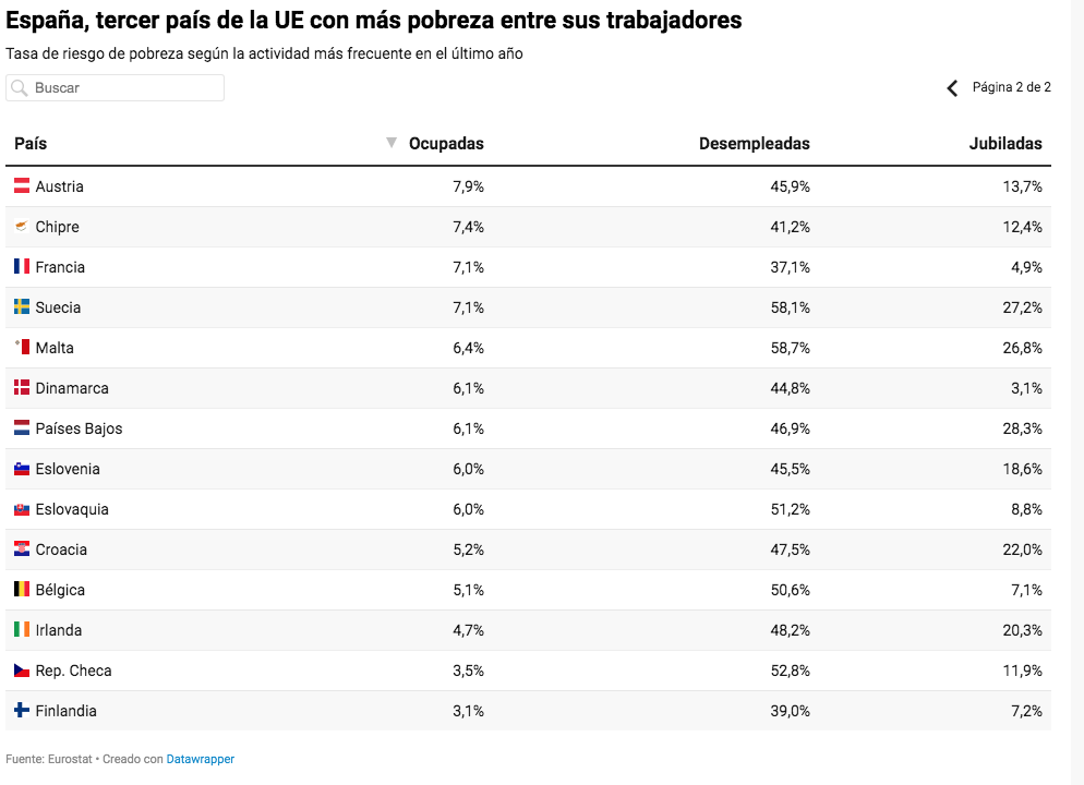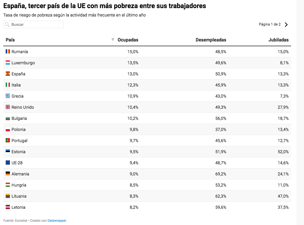 La incidencia de la pobreza entre los trabajadores también sitúa a España en los primeros puestos de la UE, con un 13% del total de personas ocupadas que viven en riesgo de pobreza monetaria. En concreto, el país es el tercero de los 28 comunitarios con un dato más alto, por detrás de Rumanía (15%) y Luxemburgo (13,5%). ¿Qué ocurre en otros países más próximos a España? En Portugal la tasa de trabajadores pobres es del 9,7%; en Francia, del 7,1%; y en Italia, del 12,3%.