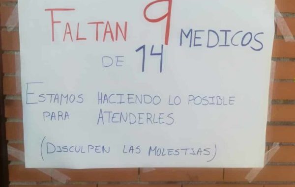 «Faltan 9 médicos de 14. Estamos haciendo lo posible para atenderles”. Es el alarmante mensaje del cartel manuscrito que aparece en los últimos días en el centro de salud de Castilla La Nueva, en Fuenlabrada, sobre la situación de la plantilla. El centro acumulaba, según el último informe epidemiológico de la Comunidad de Madrid, más de 30 casos activos de contagios por coronavirus.
