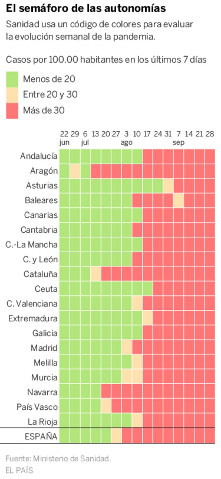 La reacción de los Gobiernos regionales fue dispar, pero ninguna comunidad empezó a tomar medidas contundentes cuando el semáforo de la incidencia cambiaba a rojo. En general, todas esperaron a que la tasa estuviera bastante por encima de 60 casos por 100.000 habitantes. El 14 de agosto, cuando España empezaba a colorearse de rojo, el ministerio reunió a todas las autonomías para acordar un paquete de restricciones en todo el territorio, como el cierre del ocio nocturno o la prohibición de fumar sin una distancia de dos metros.