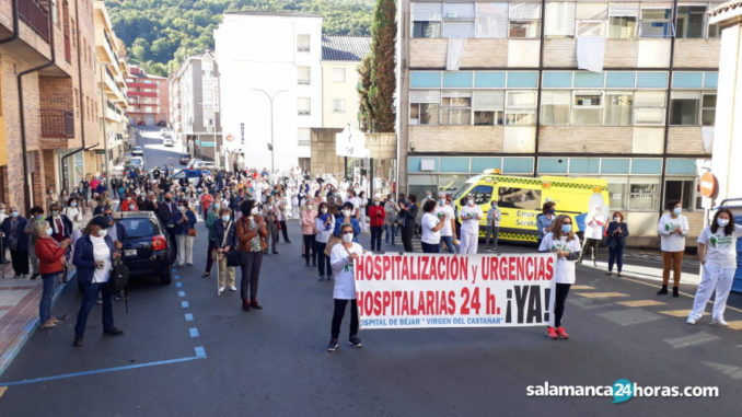 Numerosas personas han participado en la mañana de este miércoles, 7 de octubre, en una concentración celebrada en Béjar para exigir a la Consejería de Sanidad de la Junta de Castilla y León que el Hospital Virgen del Castañar vuelva a contar con todos los servicios asistenciales de urgencias y hospitalización durante las 24 horas del día.