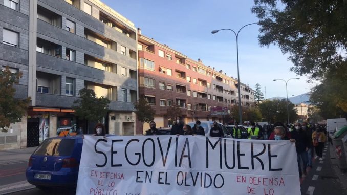 Bajo el lema ‘Segovia muere en el olvido. En defensa de lo público’, la manifestación convocada por Acción Ciudadana de Segovia arrancó en la antigua estación de trenes y recorrió el paseo de Conde Sepúlveda y la avenida de la Constitución -entre otros lugares- antes de concluir en la plaza del Azoguejo.