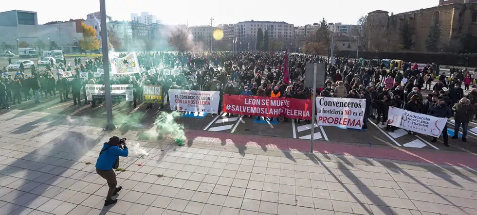 Miles de hosteleros leoneses y empresas asociadas al sector, como distribuidores, comerciantes o agencias de viajes, salieron este jueves a las calles de León para criticar “el caramelo envenenado” que supone la apertura permitida por la Junta para el día de mañana, algo que “aún no está publicado” y ante lo que el presidente de la Asociación de Hostelería de León, Martín Méndez, consideró que “abrir con las restricciones impuestas y con el cierre perimetral de la provincia en muchos casos supone abrir con pérdidas”, lo que hace que “sea inviable para muchas empresas”.