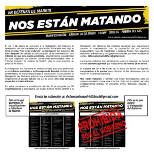 El día 1 de enero se comunicó a la Delegación del Gobierno la celebración de una manifestación para el día 30 de este mes, bajo el lema principal «Nos están matando». La Delegación del Gobierno, 26 días después de realizar la comunicación de la manifestación, nos informa de que esta queda prohibida, adjuntándonos la posibilidad de que hagamos un recurso contencioso-administrativo ante el Tribunal Superior de Justicia de Madrid, para lo cual tenemos un plazo de 48 horas.
