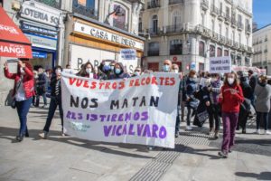 Finalmente el 14F se salió a la calle en Madrid, bajo el lema «Nos están matando», para denunciar la política de barbarie que lleva el Trifachito con la complicidad por activa o por pasiva del Gobierno Central. Mientras la Delegación del Gobierno autorizaba manifestaciones de diversa naturaleza, incluyendo la de fascistas y negacionistas, prohibía reiteradamente las convocadas por la Asamblea de colectivos, barrios y pueblos de Madrid, evidenciando su pretensión de impedir que se visibilice el proceso de construcción de un movimiento popular bajo la premisa de constituir una oposición de izquierdas en Madrid al Trifachito que gobierna el Ayuntamiento y la Comunidad, pero también a la política de complicidad con estas del Gobierno Central. El 14F dijimos «basta ya» y salimos a la calle. Tal como estaba previsto, se quedó en cuatro plazas: Ópera, Callao, Tirso de Molina y Sol para confluir finalmente en el espacio en dónde el pueblo salió a celebrar la proclamación de la II República. Obviamente la movilización no tuvo la afluencia que hubiera tenido en circunstancias, digamos, «normales»; las prohibiciones y retrasos provocados por esas prohibiciones tuvieron su efecto en alguna medida, pero el objetivo fundamental que buscaba el enemigo -invisibilizar nuestra presencia-, por supuesto no lo consiguieron.