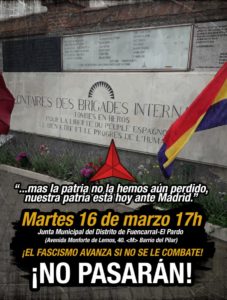 Las Brigadas Internacionales fueron recibidas con entusiasmo por el pueblo trabajador madrileño, jugando un papel de primera importancia en la defensa de Madrid contra el fascismo. No es de extrañar que quienes reivindican la memoria de los golpistas del 18 de Julio de 1936 y siguen su senda sin disimulos (única cosa que hay que agradecerles) pretendan borrar su memoria y todos los elementos de homenaje que hay en nuestras ciudades y pueblos. No lo van a conseguir; vamos a luchar en todos los frentes para impedirlo.