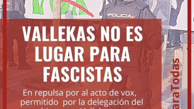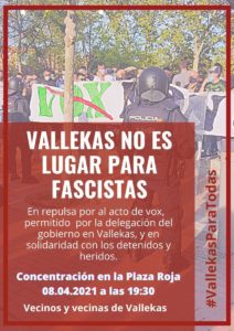 Ayer, 7 de abril, el partido ultraderechista VOX intentó instrumentalizar Vallekas en su pelea por rascar unos votos de cara a las elecciones autonómicas. Vinieron a nuestra casa a provocar unos enfrentamientos de los que poder sacar rédito político con su discurso, que pretende sembrar el odio hacia aquellos y aquellas a quienes sus políticas racistas, clasistas, homófobas y sexistas señalan como un mal a combatir, exterminar o deportar.