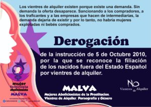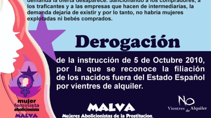Los vientres de alquiler como una forma más de violencia contra las mujeres. Por ello EXIGIMOS que se aplique la ley “con vigor” , la DEROGACIÓN de la instrucción del 5 de Octubre; ilegalizar, perseguir y cerrar las agencias mediadoras y penalizar a quienes acuden a estas prácticas, porque están“ incurriendo en un delito similar al de tráfico de menores”. Permitir la maternidad subrogada es perpetuar la desigualdad que sufren muchas mujeres sin medios económicos y validar una nueva forma de esclavitud de las mujeres.