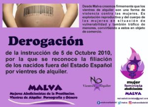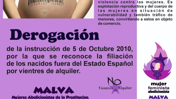 Seguimos con la campaña por la DEROGACIÓN DE LA INSTRUCCIÓN de 5 de Octubre de 2.010, por la que se reconoce la filiación de los nacidos fuera del Estado Español por vientres de alquiler, que supone el mayor agujero de ilegalidad a la prohibición de Vientres de alquiler.