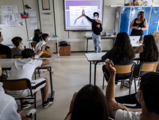 El aula es una antigua sala de informática reconvertida. Las ventanas y las puertas están abiertas. Los 20 alumnos de primero y segundo de la [SIGUE]