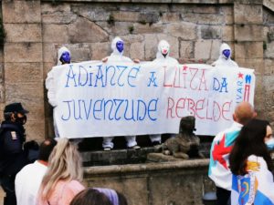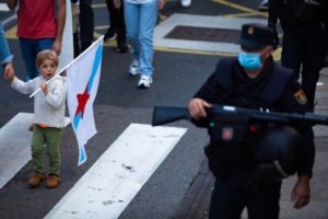 Fue muy destacable la actitud de las FSE a lo largo de ambos días: identificaciones y cacheos a jóvenes por policías de paisano, antidisturbios fuertemente armados en actitud intimidante, policía a caballo, helicópteros… Se instauró un auténtico Estado-Policial para garantizarle un tránsito tranquilo al Presidente del Gobierno, a sus ministros, a Feijoó y a la Corona española. De igual modo, el Régimen organizó un “espectáculo” de cazas que se dedicaron a surcar el cielo la mañana del 25 esparciendo humo rojigualdo sobre los manifestantes en varias ocasiones, en lo que fue una obvia acción de escarnio y provocación. Frente a ese despliegue de la Corte y del bloque dominante español, el movimiento popular gallego dio una muestra de su gran capacidad organizativa y del amplio apoyo social existente hacia un proyecto que sea capaz de superar las estructuras institucionales, políticas, económicas y culturales del Régimen del 78.