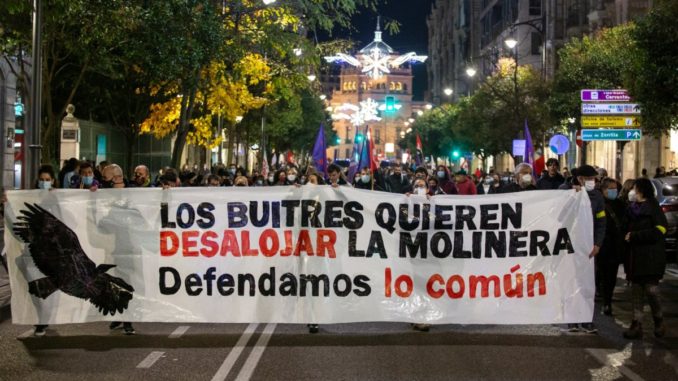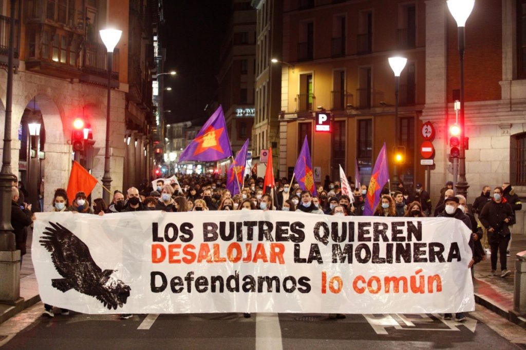 El sábado 11 de diciembre, más de un millar de vallisoletanos/as se echaron a las calles de la ciudad para manifestar su apoyo al proyecto del Centro Social La Molinera ante las amenazas de desalojo tras haber adquirido el crédito de la deuda un fondo de inversión. Con un ambiente enérgico y combativo, la marcha transcurrió por algunas de las principales vías y plazas: Zorrilla, Miguel Íscar, Teresa Gil, Fuente Dorada, Poniente, Isabel la Católica, Puente Mayor… Entre las consignas más coreadas, estuvieron las siguientes: “La Molinera, es de Pucela”; “Que no, que no, que no se desaloja”; “La Moli la defiende, la juventud rebelde”; “Castilla comunera, fondos buitre fuera”; o “10, 100, 1.000 centros sociales”. Dulzaina y tamboril, además de un conjunto de músicos con instrumentos de percusión, pusieron la nota musical a una manifestación colorida y nutrida.