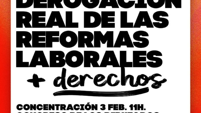 En la reunión de la Asamblea del domingo día 30 se decidió por unanimidad apoyar la concentración en las puertas del Congreso, el jueves día 3 de febrero, convocada para expresar el rechazo a la «reforma laboral» que, en forma de Decreto Ley, es decir, sin posibilidad de debate, el llamado Gobierno de Progreso va a presentar ante el Parlamento para su aprobación. Ello por un conjunto de razones, entre las que destacamos las siguientes: