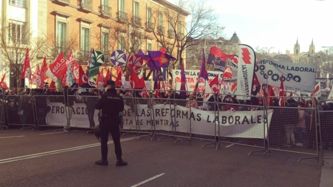 La concentración convocada por el sindicalismo de clase madrileño y apoyada por diversos colectivos sociales, incluyendo la Coordinadora 25-S, se mantuvo en el lugar durante unas dos horas. A lo largo de la mañana se fue incorporando más gente a la misma, hasta alcanzar cerca del millar de personas. La protesta discurrió con mucha combatividad, denunciando el auténtico engaño a las clases trabajadoras que supone la no-reforma de las leyes laborales de 2010 y 2012. Mientras esto ocurría fuera del Congreso, de puertas adentro se desarrolló un auténtico esperpento que pone de manifiesto una vez más, pero esta vez con especial intensidad, el carácter entreguista del llamado Gobierno de Progreso al Gran capital y a la Unión Europea.
