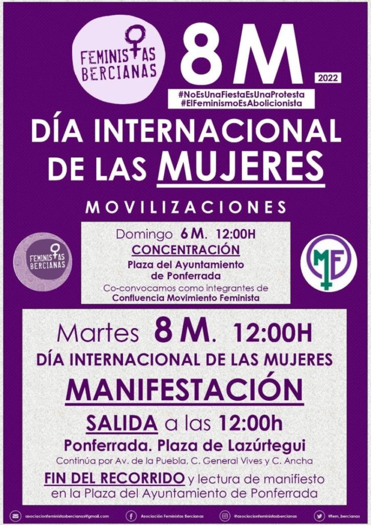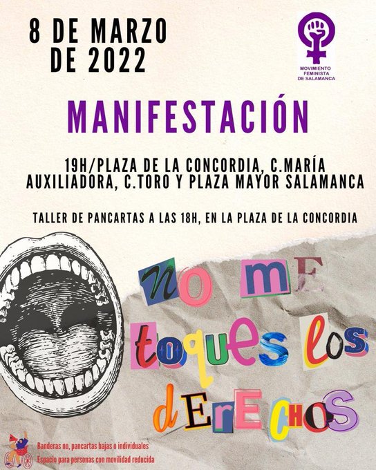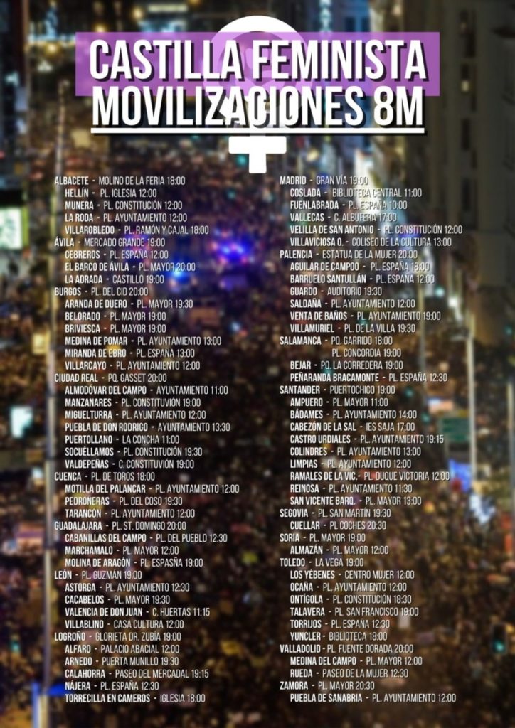 8 Marzo: Convocatorias en Castilla 7 marzo, 2022 IzCa Actualidad, Mujer, Político Social 0 Comparte este artículo: ÁVILA ALBACETE BURGOS ARANDA DE DUERO CIUDAD REAL CUENCA LEÓN PONFERRADA LOGROÑO MADRID PALENCIA SALAMANCA BARRIO DE GARRIDO, SALAMANCA SANTANDER SEGOVIA SORIA TOLEDO VALLADOLID ZAMORA Comparte este artículo: 8M8M 2022