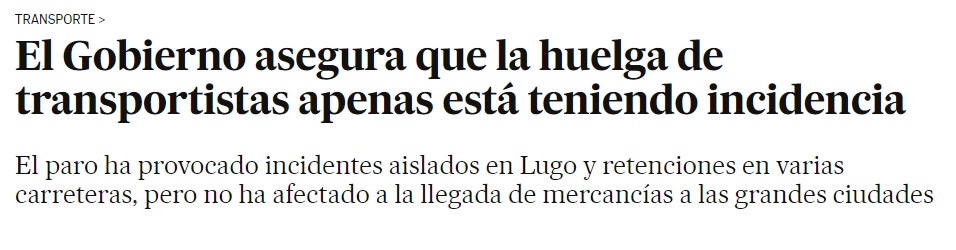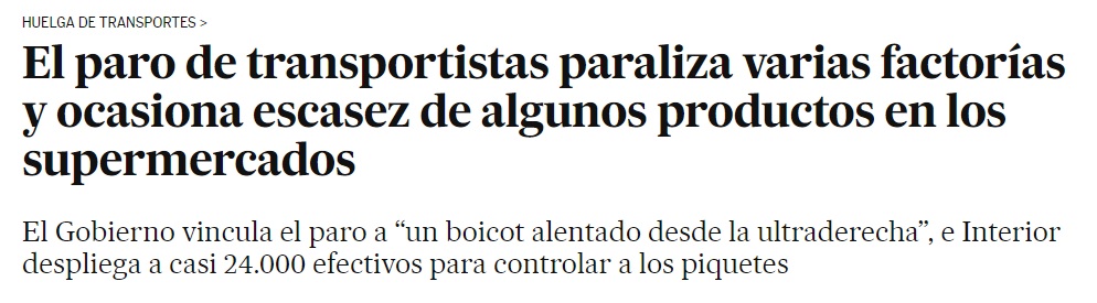 El Estado español, como es habitual, es el que asume con mayor entusiasmo el papel colonial de “criado de los yanquis”. Esto sucede, entre otras cosas, debido a su condición de eslabón débil del capitalismo europeo y por la ausencia de proyecto autónomo alguno, que se intensificó con el proceso de entrada en la OTAN y en la UE. Entre las consecuencias de esta ausencia de soberanía y de proyecto propio, también se encuentra la sustitución de una forma absolutamente burda de la información por la manipulación, cuestión que en pocos días les obliga a desdecirse. Cuando empezó la huelga del pequeño y mediano transporte, anunciaban que esta no iba a tener repercusión alguna. No aciertan ni por casualidad. Ya han tenido que reconocer, ante las evidencias, que la huelga del transporte se ha convertido en un serio problema.