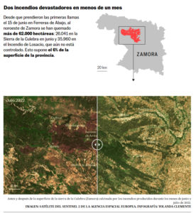 Los bomberos desgranan sus miserias mientras vigilan que no haya rebrotes entre esas columnas de humo que parecen piras funerarias. Los nuevos incendios, alimentados por el cambio climático, requieren recursos… y que los bomberos no pasen hambre. Este equipo recalca que pasan jornadas enteras sin ingerir nada porque la comida no llega y que los bocadillos no siempre sacian a quienes se fajan con el fuego. Las escenas que se producen ante la comitiva solidaria del chef José Andrés, que reparte alimentos para estas cuadrillas, lo acreditan. Los brigadistas disfrutan con ilusión infantil de una ensalada de pasta, algo inaudito en su oficio: “¡No estamos acostumbrados a esto!”. Otro, tenedor en ristre, lo celebra: “¡Llevo 30 años comiendo bocadillos!”. La imagen la contempla, resignado, un bombero de Zamora capital, desplazado a Tábara. El hombre se solidariza –“¡No pido que les pongan langostinos!”- y lamenta la falta de prevención, la escasez de retenes y que “la gestión no es efectiva”. Los datos lo avalan: más de la mitad del terreno quemado en España en 2022 corresponde a Zamora.