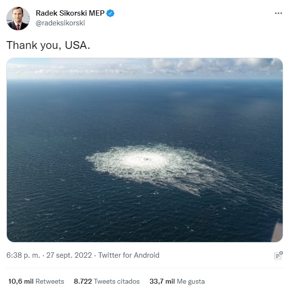 El sistema capitalista, con 500 años de vigencia, está tocando a su fin. Ya no tiene nada que ofrecer a la humanidad, e inexorablemente caerá. Está en sus últimas fases de existencia. Pero respondiendo a su naturaleza cada vez más criminal, morirá matando de la forma más cruel e inhumana posible. Por supuesto no descartan el uso de armamento nuclear en el conflicto de Ucrania; al contrario, lo están planificando. El sabotaje de los gaseoductos Nord Stream 1 y Nord Stream 2 no puede tener otra autoría más que la de comandos, más o menos irregulares, vinculados a estados occidentales como respuesta a los referéndums en el Donbás para que la población afectada decida sobre su incorporación o no a Rusia. Los comentarios del exministro de Asuntos Exteriores polaco a través de su cuenta de Twitter son un indicador muy claro de lo que decimos: