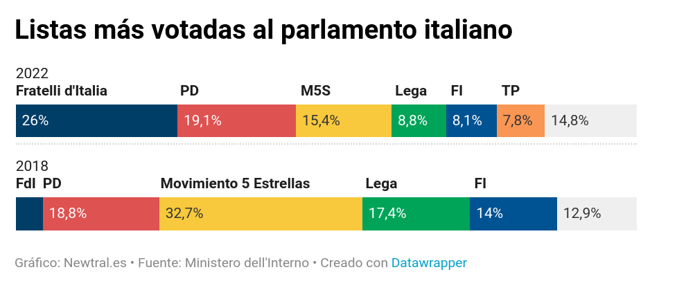 Pero volvamos a las elecciones en Italia del 25 de septiembre de 2022. Todas las encuestas, especialmente el conjunto de los análisis de las expectativas electorales en Italia, daban al bloque de derechas como vencedor, y dentro de este, al partido fascista Hermanos de Italia como claramente mayoritario (cuando hace cuatro años eran claramente minoritarios); y así ha sido. Si la izquierda claudica de sus responsabilidades ante las clases trabajadoras y aun por encima da un espectáculo de total narcisismo e inmadurez, la derrota electoral -y lo que es peor, la política- está servida.