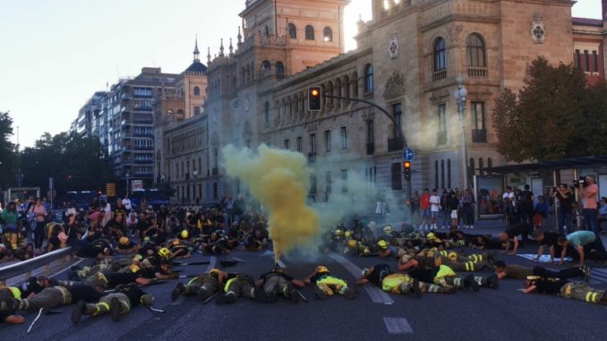 Trabajadores/as de incendios forestales de Castilla y León se han concentrado este sábado, 1 de octubre, ante el Parlamento autonómico al grito de ‘Más bomberos, menos consejeros’ y ‘la Junta promete hasta que nos la mete’ para censurar su «precaria» situación, ya que con la llegada del otoño, «cientos de efectivos se quedan sin trabajo y los castellanoleoneses sin bomberos«.
