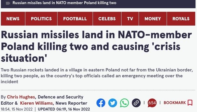 «Misiles rusos aterrizan en Polonia, miembro de la OTAN, matando a dos personas y provocando una ‘situación de crisis'», declaró The Mirror.