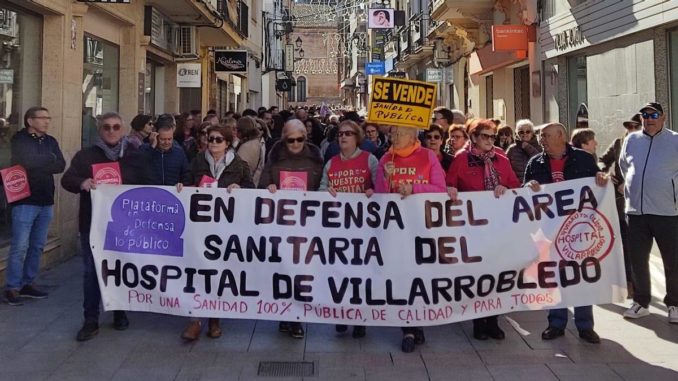 Unas 2.500 personas acudieron a la convocatoria de la Plataforma por lo Público de Villarrobledo en defensa de la sanidad pública de la localidad, para reclamar contra lo que consideran una desmantelación de los servicios no sólo en la localidad albaceteña, sino que también afecta a pueblos del sur de Cuenca, San Clemente, Las Pedroñeras y Sisante. El recorrido partió de la Plaza Vieja y siguió hasta el Hospital, parando también brevemente en la casa del alcalde. “La gente se preguntaba dónde estaba el alcalde y también dónde estaba el PSOE”, asegura Mario de la Ossa, concejal de Sí Se Puede Villarrobledo, que asistió a la manifestación.