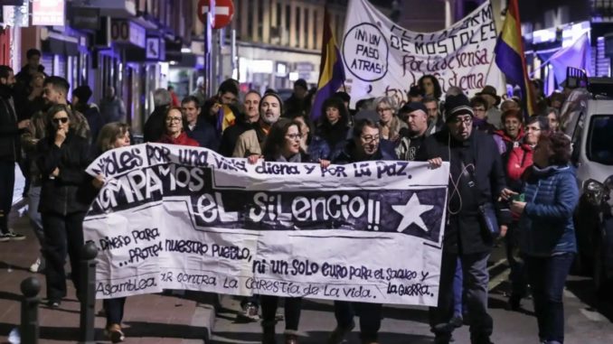 Este pasado sábado 26 de noviembre, atendiendo a la convocatoria de manifestación bajo el lema «Rompamos el Silencio – Móstoles por una vida digna y por la paz», más de doscientas personas se manifestaron por las calles del municipio. Ello a pesar del pleno silenciamiento que desde toda la prensa local y regional se impuso sobre esta convocatoria, pues ningún medio se hizo eco de la misma.