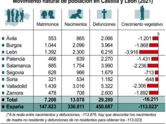 Castilla y León anotó en 2021 el segundo peor crecimiento vegetativo (nacimientos menos defunciones) de España, con 16.204 defunciones más que alumbramientos, solo superada por [SIGUE]