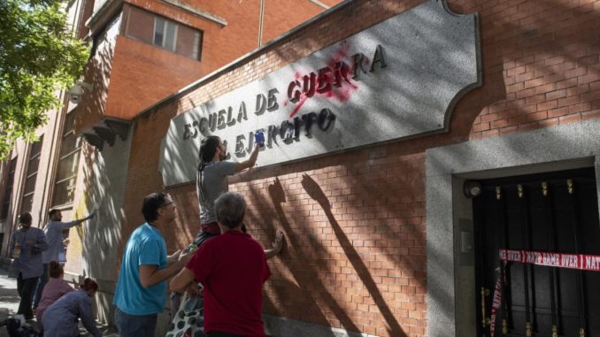 El pasado 28 de junio, y en un Madrid blindado durante la Cumbre de la OTAN, activistas de Desarma Madrid y de otros colectivos antimilitaristas, ataviados con babis y pinturas, aparecieron en la fachada de la Escuela de Guerra del Ejército en Madrid. Su objetivo: hacer pintadas por la paz. Hoy, seis meses después y tal y como ha conocido El Salto en exclusiva, la Delegación de Gobierno pide para cada uno de los 28 activistas que fueron detenidos durante esa acción una multa de 600 euros, esto es, un total de 16.800 euros por una acción que, recalcan no violenta.