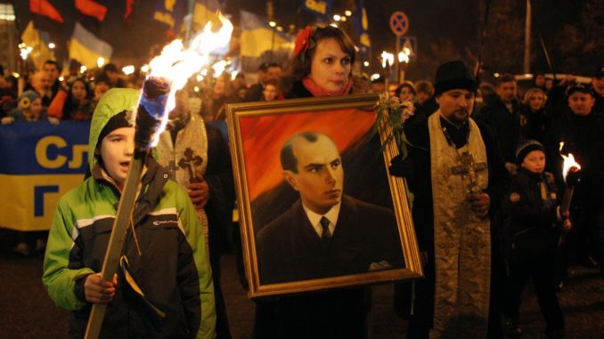 Retratos de Stepan Bandera, criminal de guerra, líder del UPA y responsable de masacres indiscriminadas de civiles, siendo aliados del III Reich