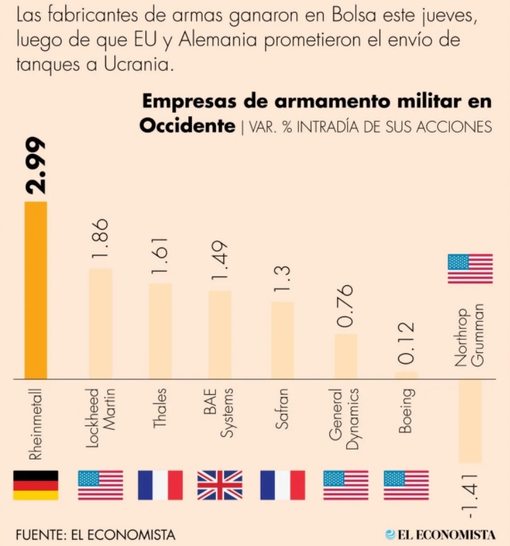 El jueves 26 de enero, en una sola jornada, las empresas armamentísticas tuvieron más que significativos incrementos en la cotización de la bolsa de Nueva York.