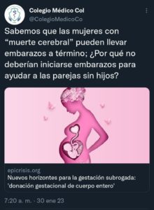 La difusión en la cuenta de Twitter del Colegio de Médicos de Colombia (CMC) de un artículo extraído de una publicación de bioética, donde se plantea el uso de mujeres con muerte cerebral para la gestación subrogada, ha generado una profunda indignación en las redes.