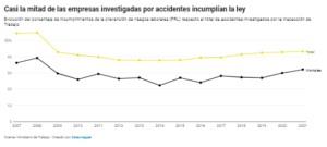 En la práctica todo esto se traduce en el incumplimiento de las medidas de prevención. “En muchos accidentes que investigamos no se cumple la normativa”, sostiene María José Díaz, de la Unión Progresista de Inspectores de Trabajo (UPIT). Así lo muestran los informes anuales del organismo, con un incremento paulatino de las infracciones de las empresas en los últimos años. La ratio de incumplimientos alcanza a casi la mitad de los accidentes investigados, el 43% en 2021.