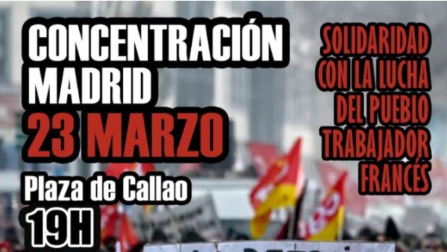 El próximo jueves, coincidiendo con la novena convocatoria de huelga general en Francia, desde el Madrid solidario e internacionalista convocamos una concentración de apoyo a la clase obrera francesa, que es también esencial para la organización y el avance de la clase trabajadora madrileña. La represión llevada adelante por las fuerzas policiales del Estado francés, con más de 1.000 detenidos/as, es toda una expresión de lo que acabamos de relatar. Muchas de estas personas siguen en los calabozos. Exigimos la libertad inmediata para todos/as y el fin de la represión.
