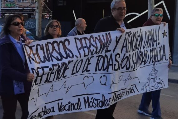 Un centenar de vecinas y vecinos de Móstoles se manifestaron el pasado sábado 25 de marzo por las calles del municipio por la recuperación del Sistema Sanitario Público, desde el Centro de Salud de la Princesa hasta el Hospital Universitario. Convocada por la Asamblea Vecinal Móstoles Pueblo Vivo, durante la marcha se clamó por dotaciones de personal y recursos que permitan una atención digna, se criticó el desvío de recursos públicos para los presupuestos militaristas y para el pago ilegítimo de la deuda y se señalaron las responsabilidades políticas de los Gobiernos Autonómico y Central en el proceso de privatización de la Sanidad, recordándose que la manera más efectiva de blindar el Sistema Sanitario Público es mediante el compromiso social, la organización popular y la movilización.