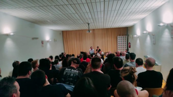 Algun@s de l@s asistentes se quedaron fuera del recinto por motivos de aforo. Quienes sí pudieron acceder al auditorio atendieron a una charla en la que el autor de la obra (Iker Ibarrondo-Merino) desgajó el desarrollo del capitalismo industrial en Castilla como condición sine qua non -ya que el deporte es un fenómeno eminentemente burgués- para comprender el desarrollo del deporte en este territorio.
