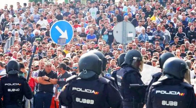 Hasta la entrada del recinto ferial de Vigo (Ifevi) se han desplazado miles de trabajadores. Aquí comenzaba hoy la feria de industrias del metal y las tecnologías Mindtech. Los manifestantes han bloqueado los accesos al certamen y también han impedido el paso en la rotonda que lleva al aeropuerto de Peinador y al servicio de la Inspección Técnica de Vehículos (ITV).