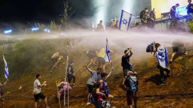 Los choques entre los congregados y los agentes de seguridad desembocaron en el uso, por parte de las fuerzas públicas, de cañones de agua para dispersar a la multitud. Hasta el momento, al menos 15 personas fueron detenidas en Tel Aviv y Ra’anana bajo acusaciones de violación del orden público y ataques a oficiales, recoge el diario The Times of Israel.