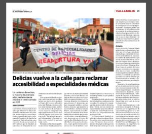 El pasado sábado 2 de diciembre se realizó, convocada por la Asociación Familiar Delicias y la Plataforma en Defensa de la Sanidad Pública de Valladolid, una movilización por la reapertura del Centro de Especialidades de las Delicias y en defensa de una sanidad pública y de calidad para la población de este barrio.
