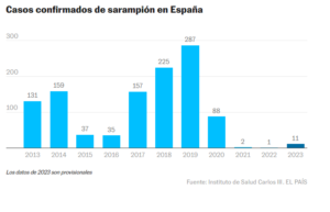España, por ahora, se ha librado del incremento. El país apenas registró el año pasado una docena de casos, todos ellos importados o relacionados con ellos, sin que llegara a desarrollarse ninguna cadena de contagios o brote relevante. Una parte de ello se debe a una cobertura vacunal que, aunque por debajo de las recomendaciones internacionales en alguna variable, sigue siendo elevada (97,2% en la primera dosis y 93,9% en la segunda, según datos del Ministerio de Sanidad).